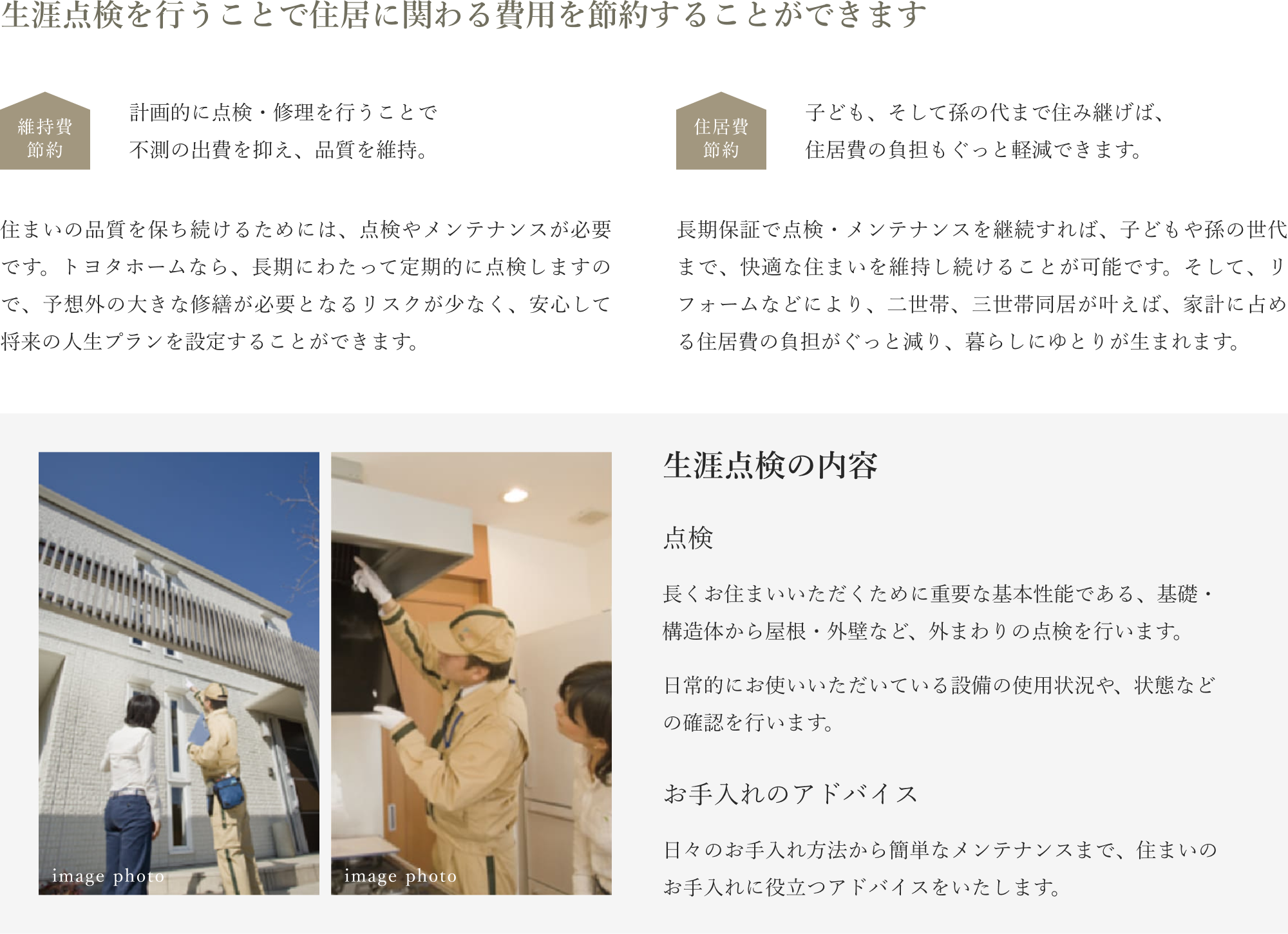 また、住まいがある限り見守り続ける生涯点検や、暮らしに役立つサービス&情報提供を行うライフサポートで、いつまでもご家族をバックアップしていきます。