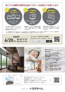 参加方法は、スマートフォンやPCなどからYoutubeにアクセス頂いて、トヨタホーム公式チャンネルのライブ配信動画を見るだけです!途中参加や途中退室もできますので、空き時間にお気軽にご参加いただけたらと思います。